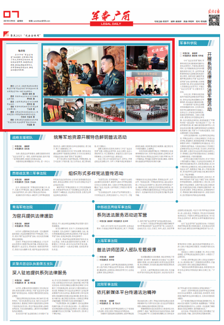 在今年的“憲法宣傳周”活動(dòng)期間,全軍部隊(duì)開展了形式多樣的宣傳活動(dòng),通過(guò)送法進(jìn)軍營(yíng)、組建普法宣講團(tuán)、提供法律援助等形式,在軍營(yíng)掀起崇尚法治、推進(jìn)法治建設(shè)的熱潮。