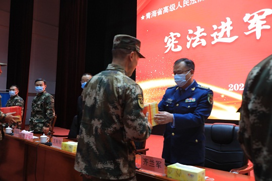 圖② 青海軍地法官向官兵代表贈(zèng)送法律書籍。羅元?jiǎng)P 攝