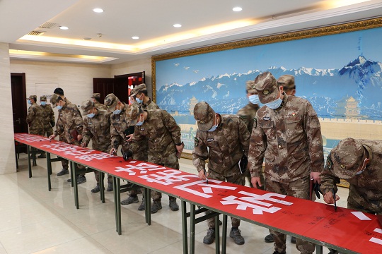 圖⑤ 在憲法宣傳活動(dòng)簽名儀式上,西部戰(zhàn)區(qū)第二軍事法院組織某部官兵簽名。王自武 王金龍 攝