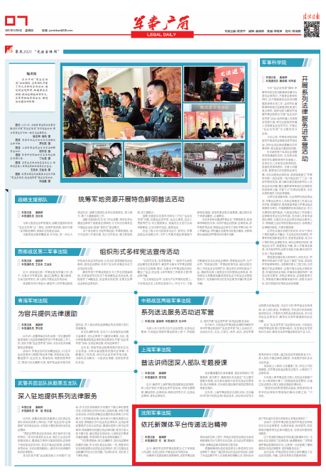 聯(lián)勤保障部隊(duì)駐沈某部排長小陳是所在分隊(duì)法律骨干,他說:“通過參加這次憲法宣傳活動(dòng),加深了對憲法賦予軍人光榮使命的理解認(rèn)識(shí),同時(shí)也學(xué)到了軍隊(duì)遂行任務(wù)中的權(quán)利義務(wù)等法律知識(shí)?!?/p>