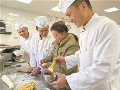 軍嫂廖夢楠特意從老家?guī)眇W料,和丈夫王萬果(左二)一起為官兵包包子,讓他們品嘗自己家鄉(xiāng)的味道。