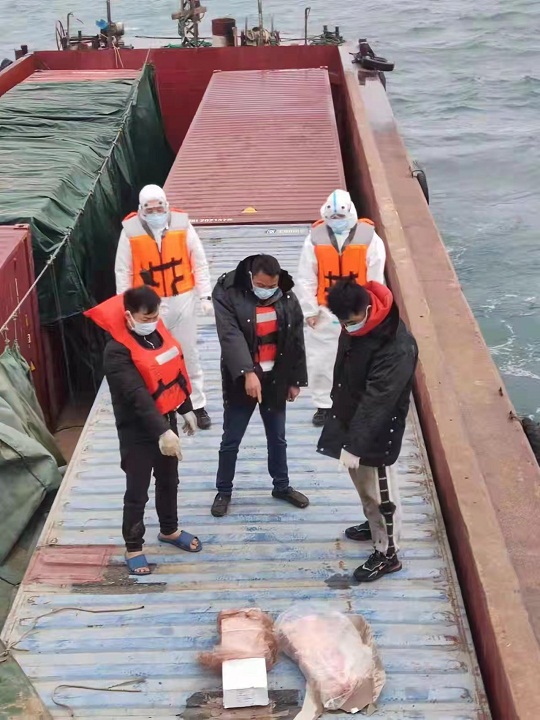 該局繼續(xù)加大“兩反”執(zhí)勤執(zhí)法力度,連續(xù)作戰(zhàn),于次日凌晨1時許根據(jù)線報指引,派遣執(zhí)法艇前往外伶仃島附近海域開展查緝行動。到達(dá)目標(biāo)海域后,海警執(zhí)法員快速鎖定了一艘無舷號可疑船舶,當(dāng)即拉響警報令其停船并接受檢查,但嫌疑船只拒不停船,并加速逃竄。該局隨即采取指揮艇與摩托艇夾擊態(tài)勢高速追擊,經(jīng)過幾輪周旋,最終成功逼停該可疑船只。經(jīng)登臨檢查發(fā)現(xiàn),該船有船員3人,載有無合法手續(xù)冷凍豬肚一批,船上人員均無法提供任何有效船舶證件、貨物合法來源證明及檢驗檢疫證明等相關(guān)資料,涉嫌走私。海警執(zhí)法員隨即將涉案船舶及所載凍品查扣,抓獲涉案人員3人。