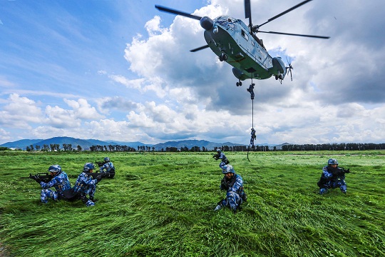 圖為到達(dá)任務(wù)地域,突擊組實(shí)施機(jī)滑降。