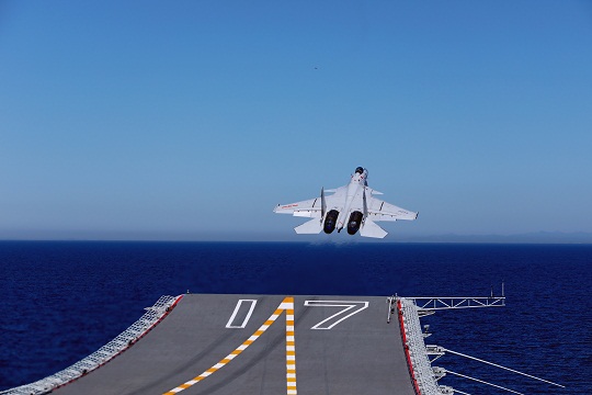 圖為殲—15艦載戰(zhàn)斗機(jī)從山東艦滑躍起飛。