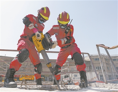 抵達(dá)現(xiàn)場,生死時速的救援行動隨即展開。搜索組沖鋒在前,隊員攜帶搜救犬在廢墟間探尋生命跡象;破拆組利用電動沖擊鉆、液壓切割機(jī)等工具,破拆垮塌的樓板;頂撐組借助承重氣墊和木塊對危險部位進(jìn)行加固,防止發(fā)生二次坍塌;轉(zhuǎn)運(yùn)組快速將救出的“幸存者”轉(zhuǎn)送至安全地帶……