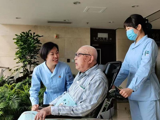 圖為高銳(左一)照護(hù)高齡住院患者。汪學(xué)潮 攝