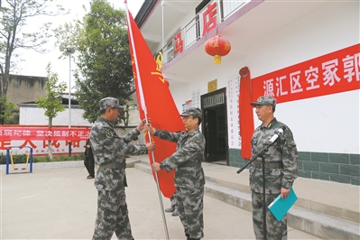 張旭初(中)向空冢郭鎮(zhèn)馬店村民兵連授旗。陳興穩(wěn) 攝