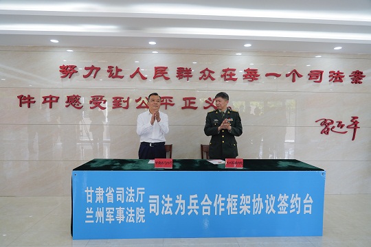 圖為甘肅省司法廳與蘭州軍事法院簽約現(xiàn)場(chǎng)。