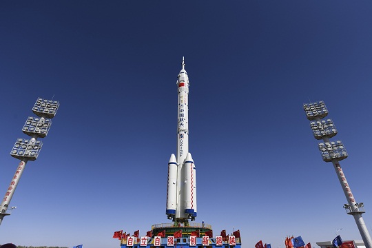 白色的長征二號F遙十四運(yùn)載火箭,靜靜矗立在藍(lán)色發(fā)射塔架旁。