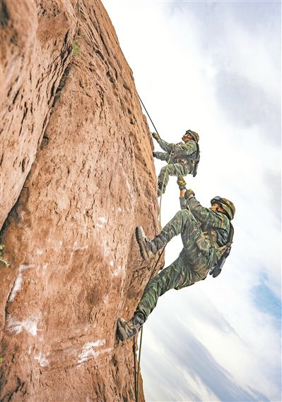 圖②:武警新疆總隊某支隊特戰(zhàn)隊員在反劫持演練中攀爬巖壁。余博 攝