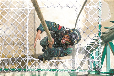 圖①:武警廣西總隊河池支隊特戰(zhàn)隊員進(jìn)行攀登抓繩上訓(xùn)練。奎子清 攝