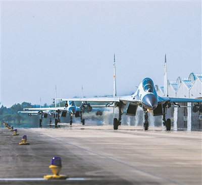 “計(jì)時(shí)起飛!”上午6時(shí)許,隨著指揮員一聲令下,數(shù)架戰(zhàn)機(jī)依次滑出起飛,在空中集結(jié)后飛赴靶場(chǎng)空域。
