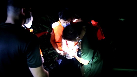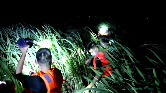 根據(jù)受困人員提供的信息,執(zhí)法員初步判斷兩人位于蘆葦蕩深處,但現(xiàn)場(chǎng)密集的蘆葦叢導(dǎo)致執(zhí)法員視野受阻,無(wú)法確定具體位置。考慮到海水仍在暴漲,群眾隨時(shí)可能遇險(xiǎn)的緊急情況,經(jīng)過短暫的現(xiàn)場(chǎng)研判,指揮員親自率隊(duì)克服風(fēng)聲嘈雜、路況惡劣等諸多不利因素深入搜尋,搜救小分隊(duì)一邊打著遠(yuǎn)光燈試圖給受困人員指明方向的同時(shí),一邊在黑夜中喊話進(jìn)行搜索。經(jīng)過20分鐘的不懈努力和細(xì)心觀察,最終在3公里外發(fā)現(xiàn)被困海中的游客,并于20時(shí)20分左右成功將2人安全救回。