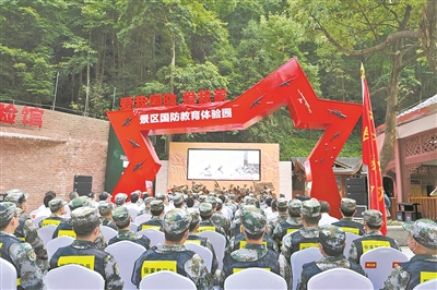 筆者走下景區(qū)“強(qiáng)軍號”小火車,一座紅色五角星形狀的“國防門”便映入眼簾,門上“愛我國防愛我家”7個大字引人注目。門內(nèi)的國防教育體驗園,是景區(qū)里一處別樣的風(fēng)景,也是近期熱度飆升的新晉熱門“打卡地”。據(jù)統(tǒng)計,85%的游客主動進(jìn)園體驗。