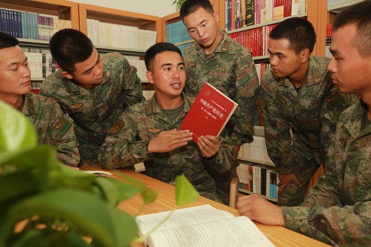 走進“紅八連”,墻上掛的、電子屏播放的都是習近平強軍思想要點;學習室內(nèi)擺放著《習近平強軍思想學習綱要》等書籍,官兵一有時間就來閱讀。政治指導員于鵬說:“在八連,大家都有這樣的危機感,理論學得不好臉上無光,一天不學理論心里發(fā)慌?!?/p>