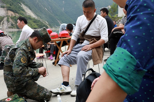 圖為武警四川總隊涼山支隊官兵為石棉縣草科藏族鄉(xiāng)受傷群眾治療。