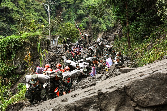 圖為武警四川總隊涼山支隊官兵徒步奔赴石棉縣草科藏族鄉(xiāng)開展搜救工作。