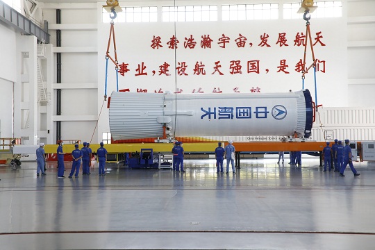 長七A火箭一進場,試驗隊隊員就忙得熱火朝天,大家正在將水平躺著的火箭豎立起來進行總裝。在垂直總裝及單元測試階段,試驗隊通過改進總裝模式,將總裝時間縮短了3天。