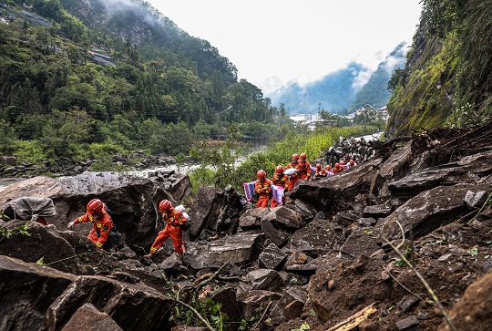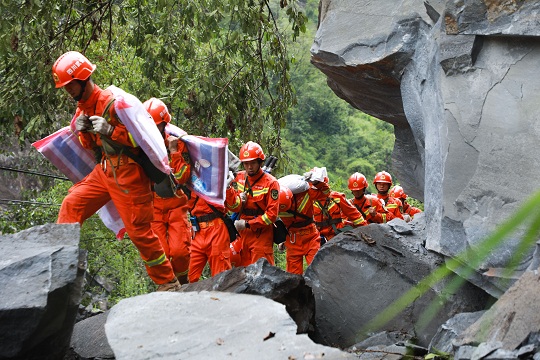 圖為武警官兵徒步奔赴石棉縣草科藏族鄉(xiāng)開展搜救工作。