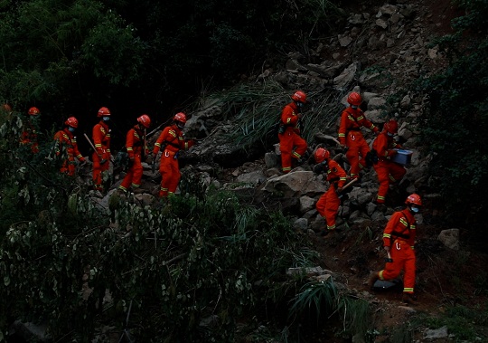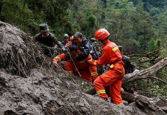 圖為武警官兵在石棉縣草科藏族鄉(xiāng)開展地毯式搜救。
