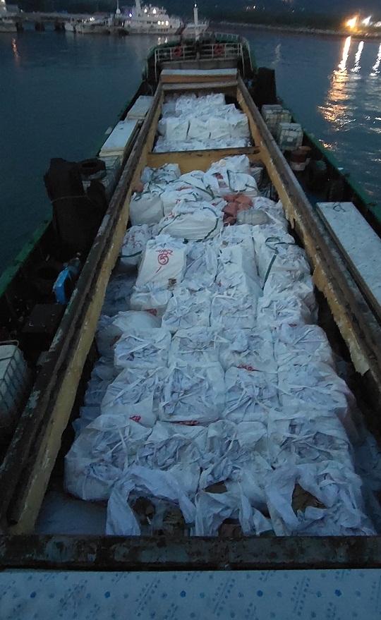 經(jīng)查,該嫌疑船艙內(nèi)滿裝大量白色編制袋貨物一批,經(jīng)開箱查驗(yàn),發(fā)現(xiàn)箱內(nèi)裝有涉嫌走私雪花牛肉、牛黃喉、牛百葉等來源不明凍品,共約200余噸。隨船人員均未能提供船舶證件及該批貨物合格來源相關(guān)證明,隨即執(zhí)法員依法對涉案船舶及所載凍品進(jìn)行查扣。