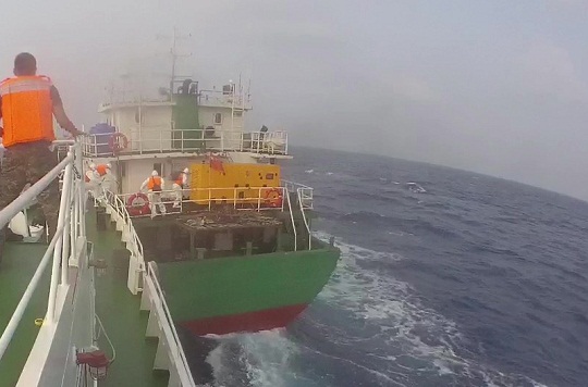 當(dāng)日7時(shí)55分,海上風(fēng)浪較大,執(zhí)法艇與前來增援的多艘執(zhí)法艇一起對其進(jìn)行圍堵攔截,在執(zhí)法艇與該嫌疑船船尾相靠瞬間,執(zhí)法員找準(zhǔn)時(shí)機(jī)對其進(jìn)行強(qiáng)制跳幫,并強(qiáng)行控制目標(biāo)船只,現(xiàn)場查控嫌疑人6名。