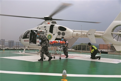 去年的一場(chǎng)綜合演練,一架地方救護(hù)直升機(jī)搭載著一名危重傷員,緊急降落在醫(yī)院停機(jī)坪。與此同時(shí),大批量傷病員也由該院和地方120組成的急救車隊(duì)安全接回。