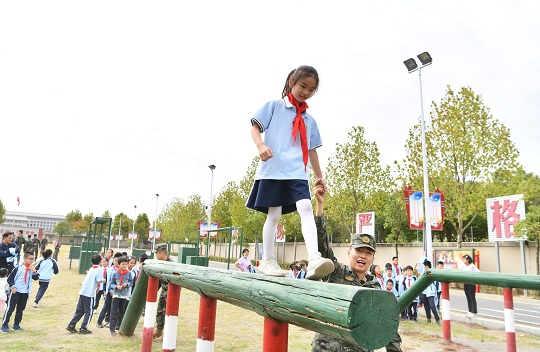圖為小學(xué)生在武警官兵的指導(dǎo)下體驗(yàn)快速通過獨(dú)木橋。