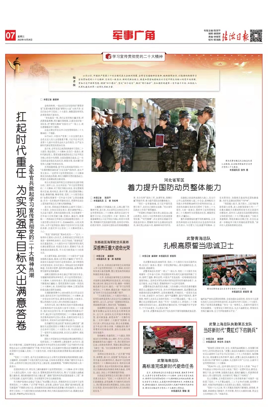 近日,武警海南總隊(duì)官兵通過宣傳板報(bào)、報(bào)紙等多種形式,認(rèn)真學(xué)習(xí)宣傳貫徹黨的二十大精神。全體官兵堅(jiān)定地表示,要將學(xué)習(xí)宣傳貫徹黨的二十大精神煥發(fā)出的政治熱情,轉(zhuǎn)化為堅(jiān)守工作崗位、認(rèn)真履行職責(zé)的精神動力,加強(qiáng)練兵備戰(zhàn)、磨礪打贏能力,高標(biāo)準(zhǔn)完成黨和人民賦予的新時(shí)代使命任務(wù)。