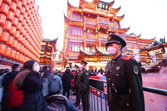 2月5日元宵佳節(jié),上海豫園張燈結(jié)彩、美輪美奐,一年一度的國家級非物質(zhì)文化遺產(chǎn)項(xiàng)目上海豫園新春民俗藝術(shù)燈會在此舉辦。節(jié)日恰逢周末,賞燈游園人群摩肩接踵?;粝?,武警上海總隊(duì)機(jī)動第一支隊(duì)官兵堅(jiān)守崗位,默默守護(hù)群眾平安賞燈。
