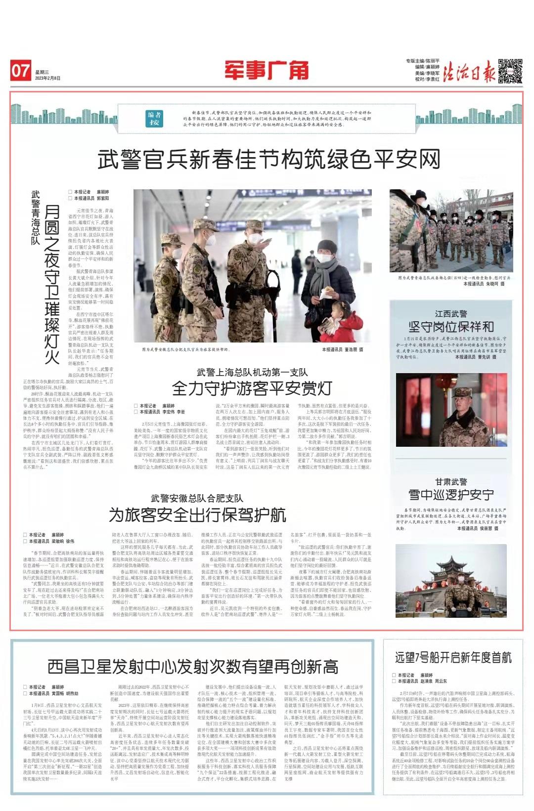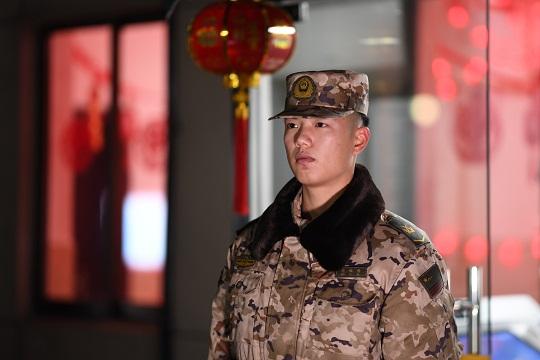 1月21日是農(nóng)歷除夕,武警江西總隊(duì)官兵堅(jiān)守執(zhí)勤崗位,守護(hù)一方平安,確保群眾度過一個平安祥和的新春佳節(jié)。圖為除夕夜,武警江西總隊(duì)警衛(wèi)勤務(wù)大隊(duì)哨兵周鈺博在南昌市某軍營堅(jiān)守執(zhí)勤哨位。本報通訊員 曹先訓(xùn) 攝