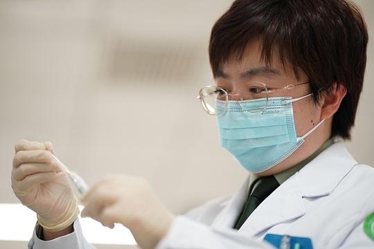 圖為武警特色醫(yī)學中心檢驗科主管技師劉持佳正在提取患者血清。程壯壯 攝