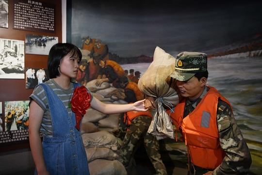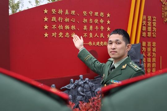 圖為武警工程大學學員萬鴻玥在武警安徽總隊合肥支隊史館父親萬四海的雕像旁緬懷追思。徐偉 攝