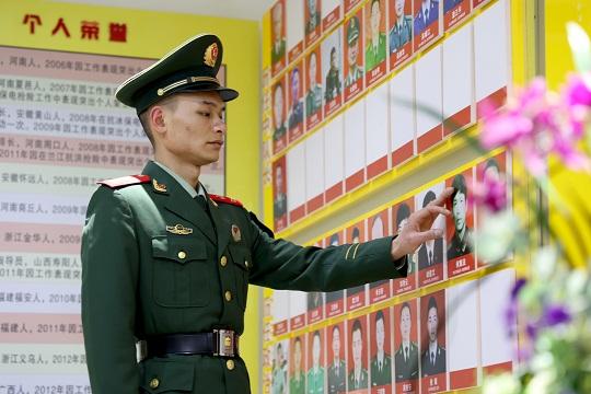 圖為清明節(jié)前夕,武警浙江總隊金華支隊執(zhí)勤二中隊二級上士何浩在中隊榮譽室緬懷父親何章法。慕仲驊 攝