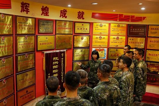 圖為武警陜西總隊漢中支隊勤務保障大隊副大隊長劉蕾在支隊史館為下隊新兵講述支隊建設發(fā)展歷程。李淼 攝