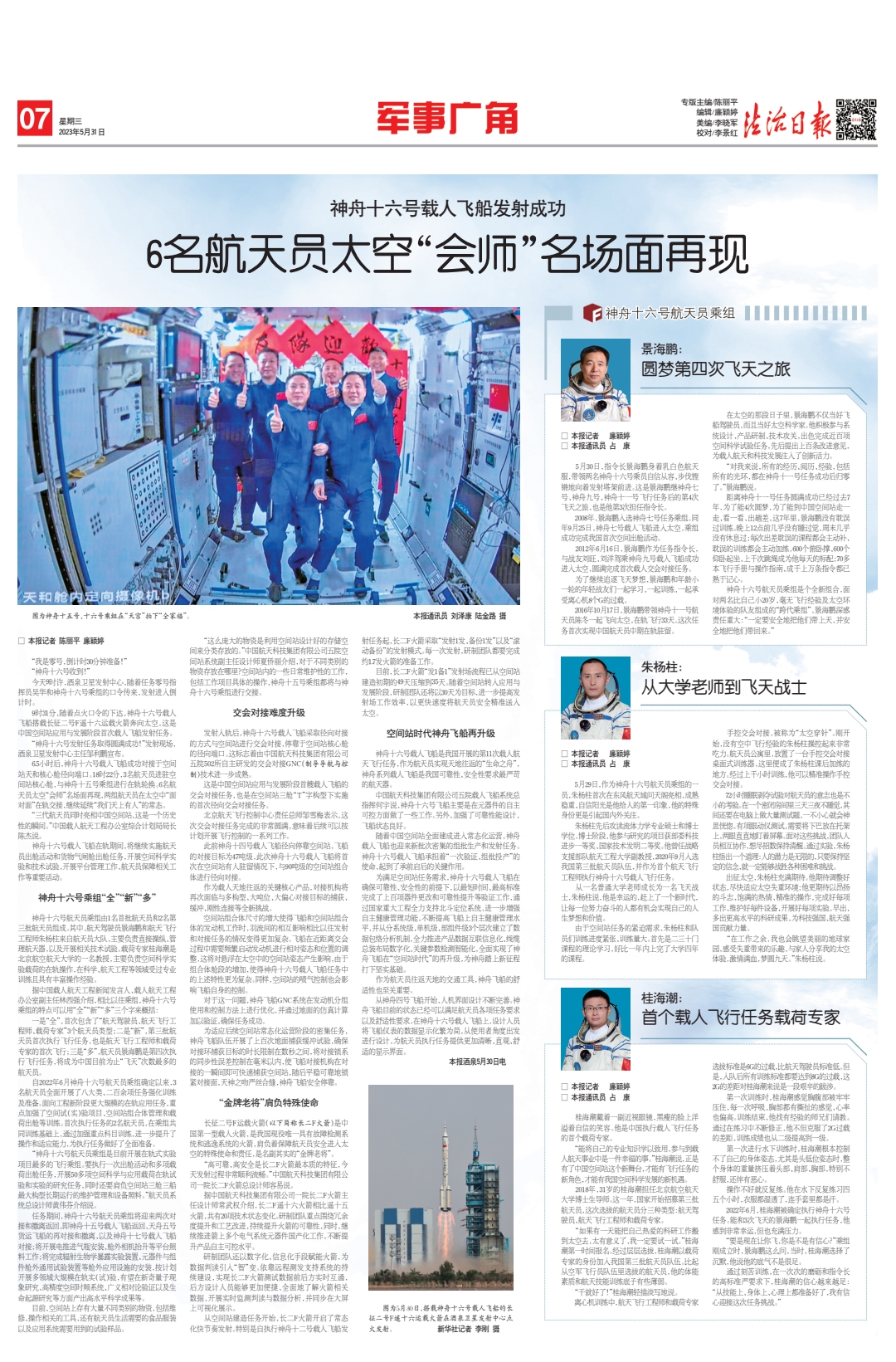 神舟十六號航天員乘組由1名首批航天員和2名第三批航天員組成。其中,航天駕駛員景海鵬和航天飛行工程師朱楊柱來自航天員大隊,主要負責直接操縱、管理航天器,以及開展相關技術試驗。載荷專家桂海潮是北京航空航天大學的一名教授,主要負責空間科學實驗載荷的在軌操作,在科學、航天工程等領域受過專業(yè)訓練且具有豐富操作經驗。