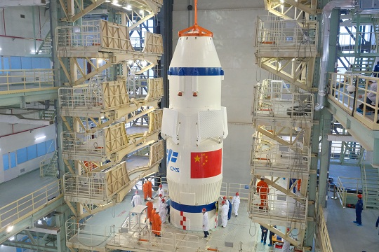 圖為神舟十五號載人飛船船罩組合體吊裝。本報(bào)通訊員 高楠拍 攝