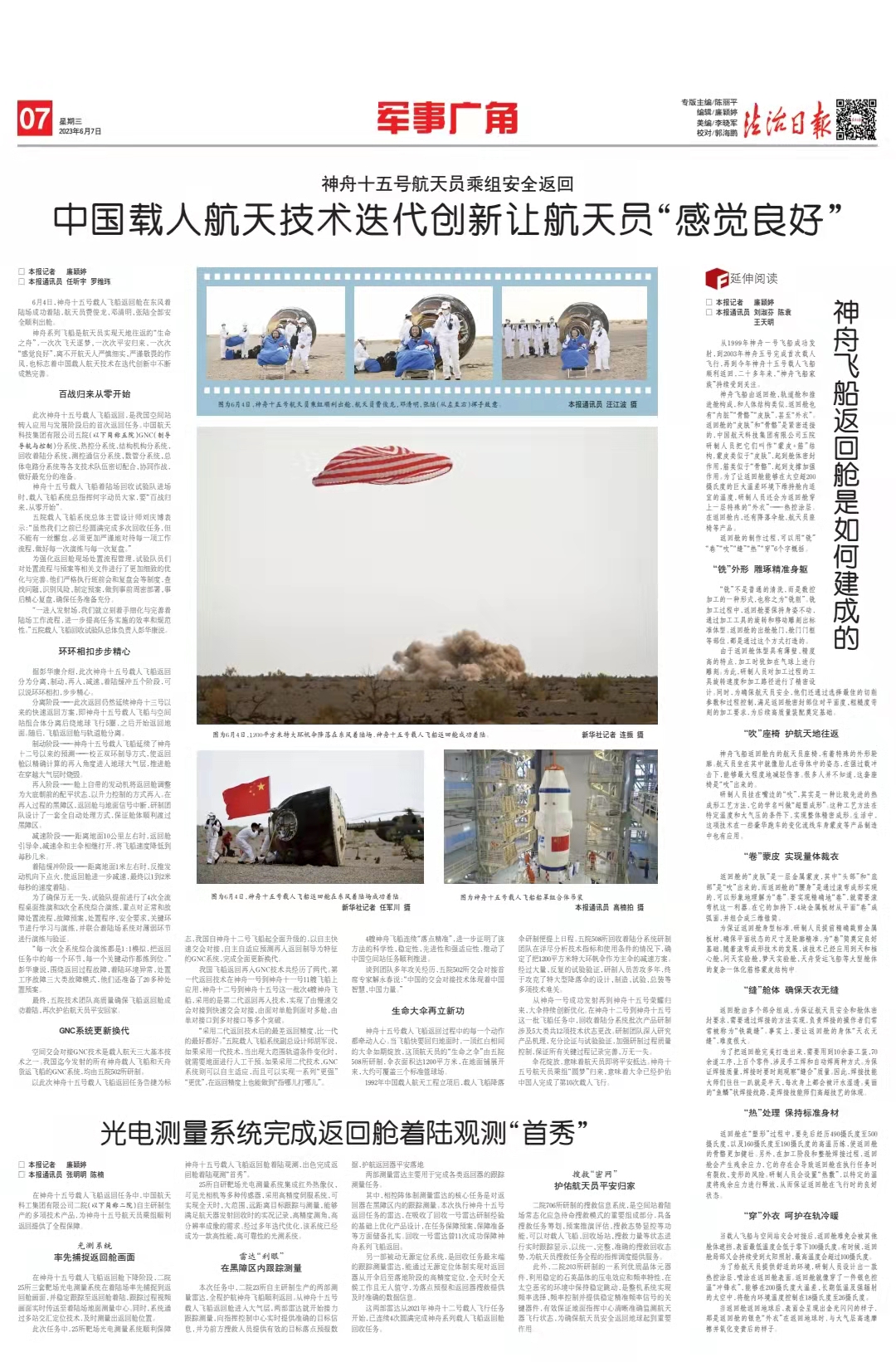 6月4日,神舟十五號載人飛船返回艙在東風(fēng)著陸場成功著陸,航天員費(fèi)俊龍、鄧清明、張陸全部安全順利出艙。