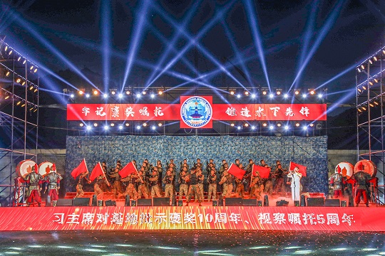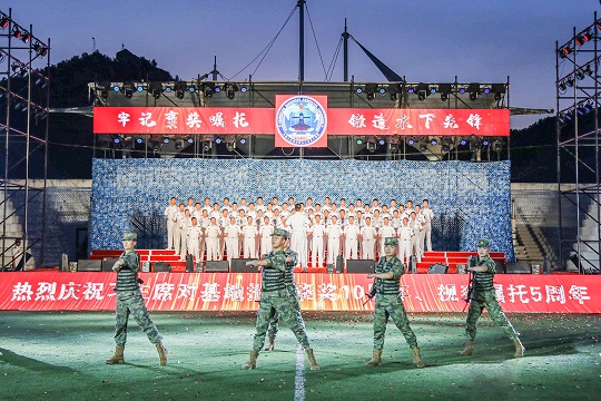 隨著音樂緩緩響起,來自援建單位湖北十八洞村八一愛民學(xué)校學(xué)生走上舞臺,與官兵齊聲合唱《不忘初心》。