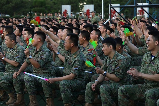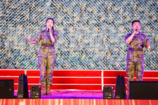 《岸訓(xùn)之歌》《壯志飛揚》《渴望光榮》《鯨港尖兵》等,演唱中靈活加入旗語、舞蹈、捧燈等元素,讓真情流露,讓情感升華。