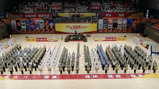 圖為8月1日上午,2023全軍院?!皬娷姳毕盗斜荣?、集中交流賽在南昌市八一體育館舉行開幕式。傅明鐘 攝