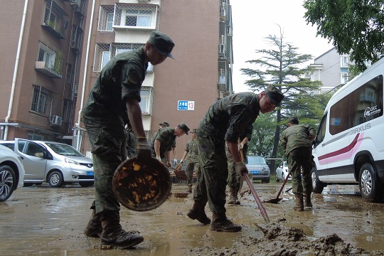 8月1日,北京市門頭溝區(qū)受連續(xù)暴雨和山洪影響,大量泥沙、草木堆積在河道兩側和市區(qū)道路,嚴重阻礙交通出行。中部戰(zhàn)區(qū)空軍某部組織官兵赴街道社區(qū),參與清除淤泥和垃圾20 余噸,積極配合駐地開展應急支援和災后秩序恢復工作。
