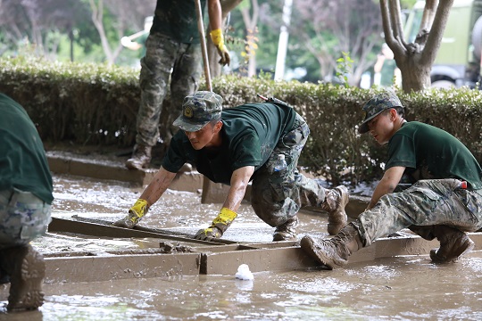 圖為武警河北總隊石家莊支隊官兵在河北涿州市陽光大街清理淤泥。楊劉 攝
