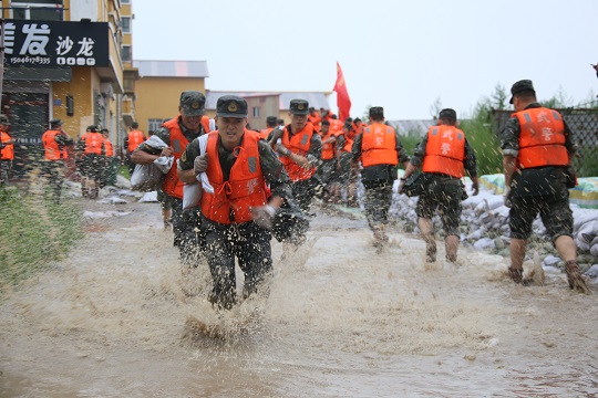 黑龍江省五常市磨盤山水庫水位暴漲,導(dǎo)致漫堤。8月4日,北部戰(zhàn)區(qū)第78集團(tuán)軍某工化旅官兵火速馳援?!翱炜?,子弟兵來了,我們得救了!”在一處樓房里,10多名困在洪水中的村民正翹首等待救援。把虛弱的老人背上肩頭,把受驚嚇的孩子摟在懷中,把受災(zāi)的群眾送到安全處……這天,官兵連續(xù)奮戰(zhàn)20小時,挨家挨戶搜救被困群眾151人、轉(zhuǎn)移群眾3100余人。
