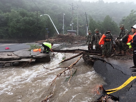 前進(jìn)路上,折斷的樹木和電線桿倒伏在河道,部分路基被河水全部掏空,路面整段塌陷下去?!翱禳c(diǎn),再快一點(diǎn),把情況摸清楚!”朱鵬宇和戰(zhàn)友們?cè)跊]過小腿的洪水中加速挺進(jìn)。