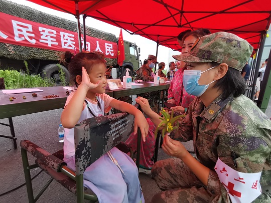 “寶貝兒放心,阿姨一定仔細(xì)給你瞧瞧,對(duì)癥用藥之后,就不會(huì)又癢又疼了。”醫(yī)療隊(duì)員孟博從診斷席上走出來(lái),將小女孩兒抱上軍用折疊椅,輕輕地?cái)]起小女孩兒的褲腿,發(fā)現(xiàn)小腿局部皮膚會(huì)出現(xiàn)紅腫、水皰,且有明顯瘙癢等癥狀,初步診斷為被毒蚊叮咬浸水感染。隨即對(duì)其創(chuàng)面清潔、消毒、涂藥,之后又給她贈(zèng)送了止癢、消腫、消炎等藥品,并向她媽媽交代了注意事項(xiàng)。