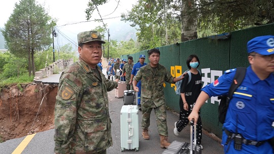轉(zhuǎn)運(yùn)現(xiàn)場(chǎng),救援人員逐一清點(diǎn)人數(shù),幫助學(xué)生們整理好行李,有序組織轉(zhuǎn)運(yùn)。遇到斷橋,救援人員搭建起簡(jiǎn)易扶梯,協(xié)力攙扶學(xué)生,將他們逐一送至岸邊安全地域。遇到?jīng)_毀路段,救援人員組成人墻將孩子們護(hù)在崖壁內(nèi)側(cè),迅速通過(guò),直至將他們安全送至鎮(zhèn)上的大巴車上。