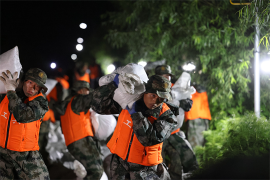 圖為北部戰(zhàn)區(qū)陸軍某旅成立黨員突擊隊(duì),在吉林省扶余市弓棚子鎮(zhèn)拉林河楊家崴子段封堵決口。王馳 攝