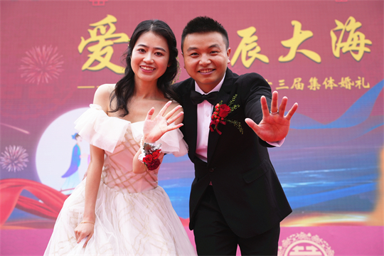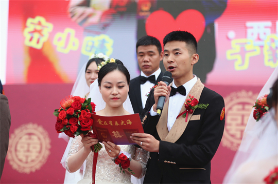 舞臺(tái)、氣球精心裝扮,美景、佳人喜迎幸?!槎Y現(xiàn)場,新郎們身著深色西裝,筆挺英?。恍履飩兩泶嵃谆榧?,美麗動(dòng)人。一個(gè)個(gè)精心設(shè)置的儀式,一張張洋溢幸福的笑臉,讓這場集體婚禮甜蜜加倍、幸福爆表。