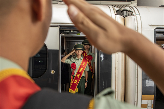 圖為退役士兵敬禮互送。楊肖飛 攝